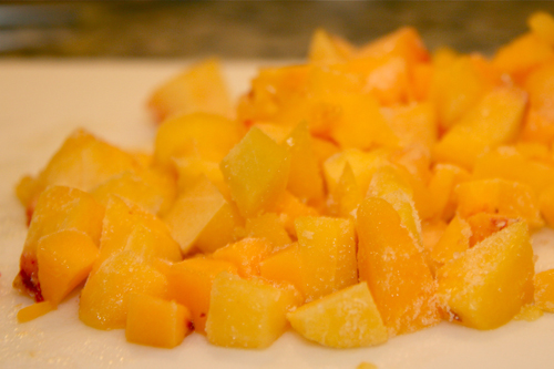 3/4 c. chopped peeled and pitted peaches (I used frozen for the sake of time…they are already peeled)
