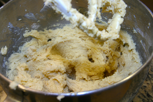 Heat oven to 350 degrees.  Cream together the butter, sugar and shortening with the paddle attachment of an electric mixer.  Add eggs, vanilla, lemon juice or extract and light corn syrup. Combine together on medium speed.  In a separate mixing bowl, put in flour, baking soda and salt and whisk to disperse ingredients.  Add 1/3 of the flour mixture to the sugar mixture and then 1/3 of the sour cream.  Cream together with mixer.  Repeat until all of the flour and sour cream are incorporated.  Don’t over mix.