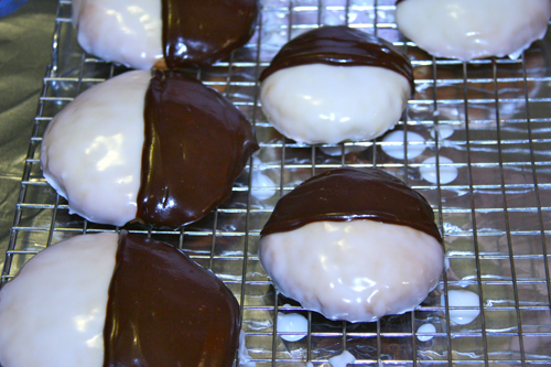 For me, though, there’s one glitch in making these cookies even with the perfect recipe. The problem with me and Black and Whites is that I am kind of a mad scientist type of chef in the kitchen and Black and Whites SHOULD have a crisp and tidy appearance if done properly.  In the perfect cookie world, Black and Whites should have a straight line running down the middle where the chocolate and vanilla icings nicely cohabitate.