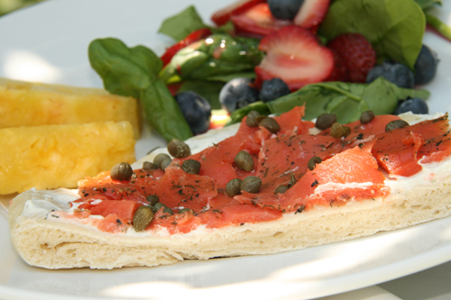 I can’t remember for the life of me what the Showcase house itself looked like, what style it was in or anything else about that evening, but I DO remember sitting on the lovely patio, breeze blowing, and taking bite after bite of that tender pizza crust with luxurious layers of pink smoked salmon on top of a tangy, dill infused cream cheese.