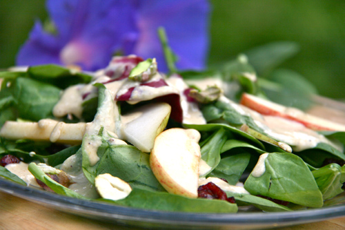The pistachio dressing tastes so creamy that you would swear there is some cream or milk in there somewhere.  But no, there is not. Just wonderful toasted pistachios, canola oil, water and lemon juice make up this emulsion.  This dressing is TO DIE FOR, and I think it is very versatile and would be delicious over chicken as well.