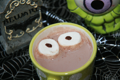 For that uber scary cup of hot cocoa which is staring back at you, just cut a large marshmallow in half and either place a chocolate chip or a little dot of melted chocolate on top of each half of the marshmallow.  Then put the mug back in the microwave for just 10 seconds to melt the chip into the eye so they stay put.