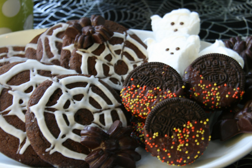 If you are a Halloween crazed lunatic like myself, then you have a tarantula chocolate mold just sitting around waiting to be used so now is the time!  If not just buy plastic spider rings to decorate the platter, and let the kids put them on as the cookies vanish.