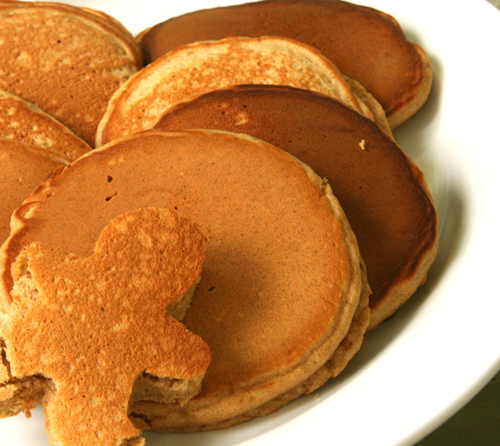 In a separate bowl or large liquid measuring cup, whisk together milk, molasses, eggs and oil.  Add the liquid ingredients to the dry ingredients all at once whisking only 10-15 times so that batter is just combined but there are still some lumps.  Over mixing will cause the pancakes to be tough.   Ladle pancake batter onto pan.  Cook on the first side until bubbles start to form on the batter or take a peek with your spatula and flip it when it begins to look brown/golden.  Cook another minute or two until pancakes look done.  Do not press your spatula on top of the pancake, thinking that will help it cook all the way through.  This would eliminate air pockets and thus create a denser, tougher pancake.  That is not what we are going for here.