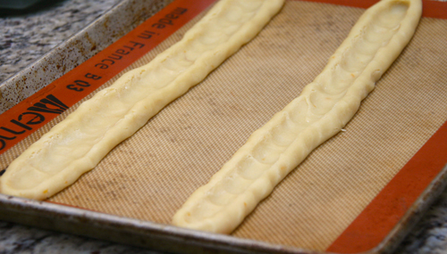 If the dough is crumbly, add 1 or 2 more tablespoons of softened butter and mix together.  Take scoops (hand fulls) of dough and form them first into a ball and then begin to roll in between your hands to form long ropes.  Once the rope is getting too long to roll in your hands, place on a cookie sheet and roll with your hands until the rope is almost as long as your pan.