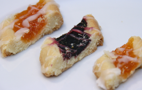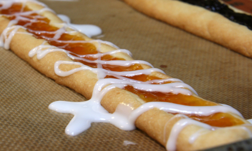 Press your index finger down the middle to form a crater or canal down the middle.  Bake for 10 minutes on 350.  Take out and spoon jam into the groove, then return to the oven for 8-10 minutes, until golden.  Cool slightly and then drizzle with the glaze and cut into diagonal strips.