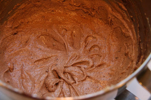 In a large mixing bowl, whisk together the dry ingredients, flour through salt.  Then, in the bowl of  stand mixer, cream together the butter and sugars with the paddle attachment or with a hand beater on medium speed.  Then add the vanilla and cream together.  Add the eggs, one at a time, beating a minute in between each egg on medium speed.  Scrape the sides of the bowl.  Add the melted BUT COOLED bittersweet chocolate to the butter mixture.  If you add the chocolate hot, it will curdle your eggs.  Beat on medium until it looks creamy and chocolaty.
