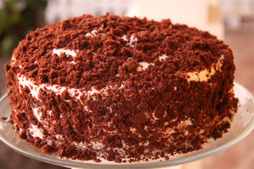 For the fourth layer, crumble it into tiny crumbs.  Sprinkle the crumbs on top of the cake.  Take a handful of crumbs and press your hand into the sides of the cake and repeat until the sides of the cake are covered with cake crumbs.