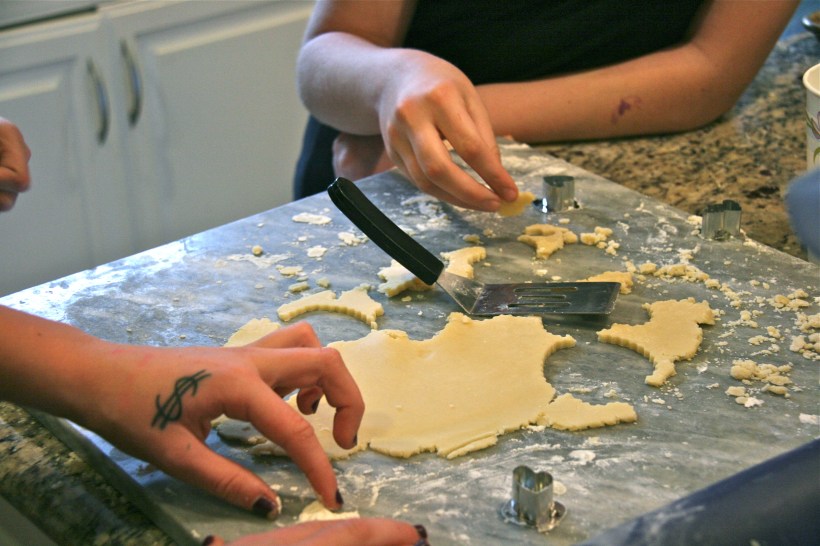 This was a pretty big coup as far as my girls were concerned.  They were being told they could EAT THE COOKIE DOUGH! This cookie project ended up being a huge success as girls happily cut out and nibbled on dough, chatted away and spread Nutella or Jam on their cookies while being politely asked not to lick their fingers.