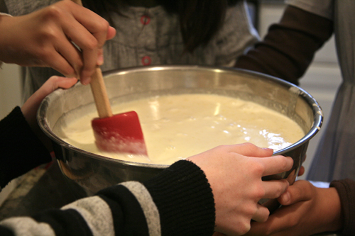 Her sister needed to bring one of these cakes to Girl Scout World Thinking Day and together, along with my daughter, they were going to make it at my house this weekend so that I could post it.  The three girls worked together like an Olympic bobsledding team who seem to know each others’ every move, and in no time whipped up a double batch of this recipe so that we could have one whole cake to keep. Lucky us! It’s delicious and absolutely addictive.