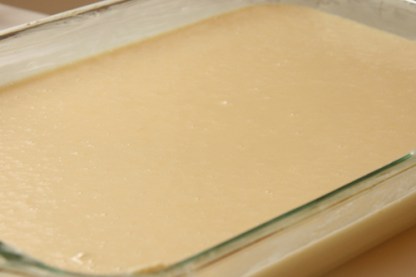 In a large mixing bowl, whisk together mochiko flour, sugar, baking powder and salt. In a separate bowl or large liquid measuring cup (4 cup capacity), beat eggs, then add coconut milk, melted butter and vanilla extract. Carefully, pour the wet ingredients over the mochiko flour mixture and whisk until the mixture is smooth and uniform in texture.  Pour batter into the greased 9×13 pan.  Carefully, smooth out the top.