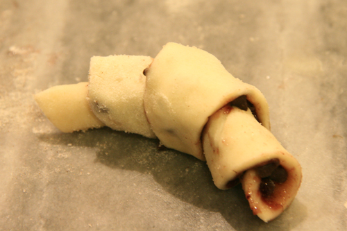 Once the Rugelach dough is all sliced up, start with one slice and roll from the widest part (outside edge) inward nice and tight—just like a sleeping bag.  If you have ever made those Pop n’ Fresh Crescents then you are a pro.  Once your little Rugelach sleeping bag is all rolled up, bend it just a bit in to form a crescent shape.  Voila! Easy peasy.