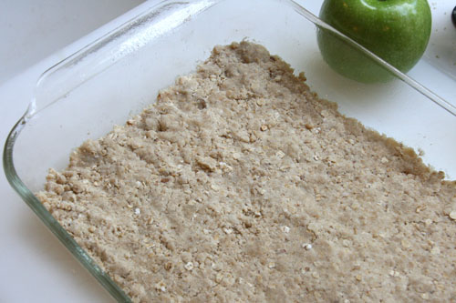 Press 1/2 of the crumbly mixture firmly in the bottom of your prepared pan. Bake for 10 minutes and then set on a wire rack.