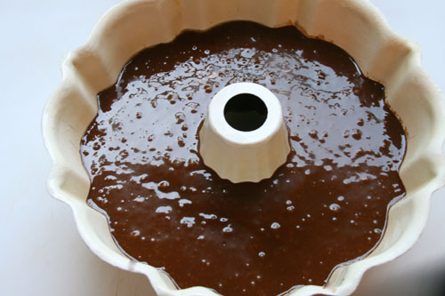 For the Cake: Preheat your oven to 325 degrees. Spray your bundt pan with cooking spray or prepare your two round 9 or 8 inch baking pans by spreading a pat of butter all over the bottom and sides of each pan. For cupcakes, just line your muffin tin with liners. Then drop a tablespoon of flour in each pan and tap the flour all over the pan, sideways and upside down at the end (over the sink) to remove excess flour.  IMPORTANT: Make sure there are NO ungreased, unfloured spots on your pan.  If there are, add a little more butter and flour on those spots.  Heat your oven to 325 degrees.