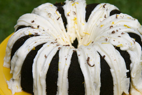 For the frosting: In the bowl of a stand mixer fitted with a paddle attachment beat together the butter and cream cheese until smooth.  Add the Cointreau and sifted powdered sugar and beat to oblivion until you have a nice smooth frosting.  If it is too runny, add powdered sugar 1/4 c. at a time until the thickness you need for frosting.  For the bundt cake, I put the frosting into a ziploc bag fitted with a large piping tip and piped the big swoops of frosting in a zigzag motion.  Don’t let your frosting sit out and get soft.  It’s much better to work with it when it’s cold and a little bit thick/firm.