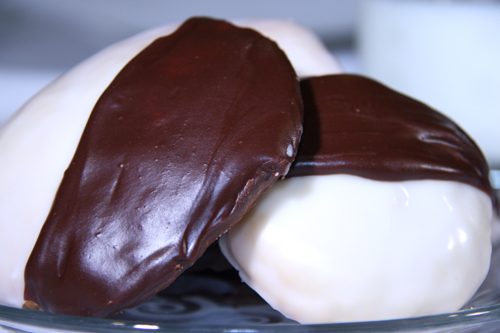 Black and White cookies are the perfect finale to any deli experience. If done right, they are soft and tender, rich and smooth. They are the soul mate to an icy, cold glass of milk. This particular recipe from the All-American Cookie Book is that kind of nostalgic deli-style black and white.