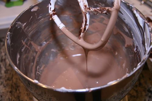 Everything was moving along.  Second cake in the oven…check, frosting refrigerating…check, Grasshopper pie “firming up”…check. At this point my kitchen looks like there was a chocolate massacre (and so does my white t-shirt I might add), but things were happening and desserts were being completed.