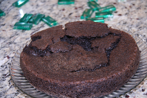 Did I shout four letter words?  Did I give up and throw in the towel?  NO!  I simply knew I could whip the batter right up and make a second cake.  No problema!  I am woman, hear me roar!  In the meantime, my chocolate Grasshopper Pie looked fab, and I popped it in the fridge to “firm up”, as the recipe indicates, for five hours.