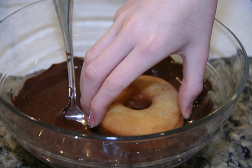 To glaze, I set up three bowls. One bowl with the melted chocolate, one with the maple glaze, and one with the bacon crumbs. As my daughter and I glazed the doughnuts and my husband sprinkled the top with the bacon, we would place them on a rack. Underneath the rack, I placed sheets of aluminum foil to catch the drips. Under the High Chair also has a great sounding coffee glaze on her site that you may want to try. Let me know how it goes!