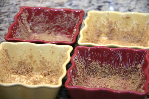 Start by setting your oven to 350 degrees and buttering six ramekins.  If you don’t own ramekins, simply use a medium-sized casserole dish or a small-ish rectangular glass dish.  Let’s not be choosy here; it’s the end result that counts.  Then sprinkle each ramekin with about a tablespoon of dark brown sugar (light will work fine if that’s what you have) or sprinkle your casserole dish with 5 tablespoons of brown sugar.  Tap your dishes and make sure they are adequately dusted in the brown sugar (just like flouring a cake pan!).
