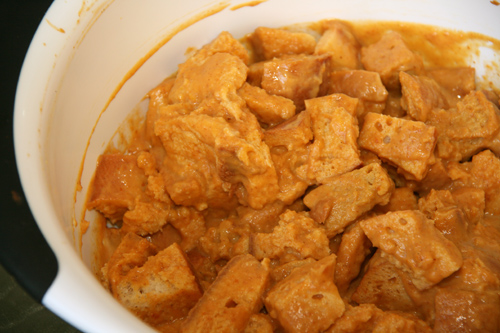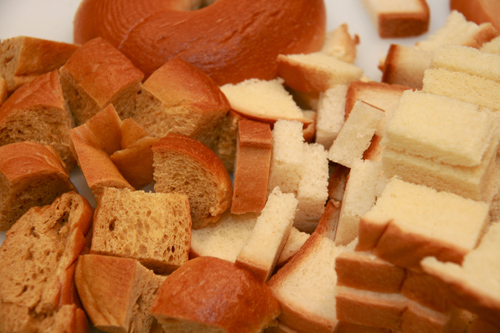 Left over bread (about a loaf –I used 1/4 a loaf of one left over loaf and 1/2 a loaf of another loaf I had) + 1 or 2 day old pumpkin bagels (Martha recommends 12 oz of day old Challah bread which would be absolutely wonderful but any day old bread you have lying around works perfectly well).  The bread amount is not an exact science…a little too much or too little will be just fine.