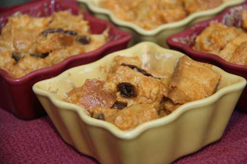 Alternately, divide bread mixture into two equal portions before adding the raisins.  Add the raisins to one bowl and 3/4 c. of good quality chocolate chips to the other bowl.  Then divide into the ramekins. Place all ramekins on a baking sheet before putting in the oven for ease of transportation.