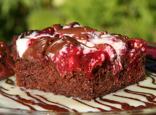 Assembling your cake: Pour and spread the cranberry compote over the chocolate cake. With a small spoon drizzle half of both the chocolate and white chocolate ganache over the cranberry topping. Refrigerate the cake for an hour before serving to let it set up a bit. Reserve the remaining ganache in the refrigerator. When serving, heat the remaining ganache in the microwave for 20 seconds or until thin again. Use the white chocolate to spoon as a base sauce on the serving plates and drizzle the dark chocolate over the white for effect. I like to use a plastic condiment bottle for this type of drizzling. It works great! Or for an easier serving style, serve the two ganache in small serving pitchers on the table and guests can freely pour the ganache over their cakes if they want extra ganache.