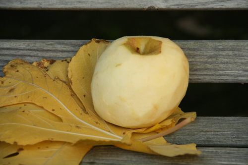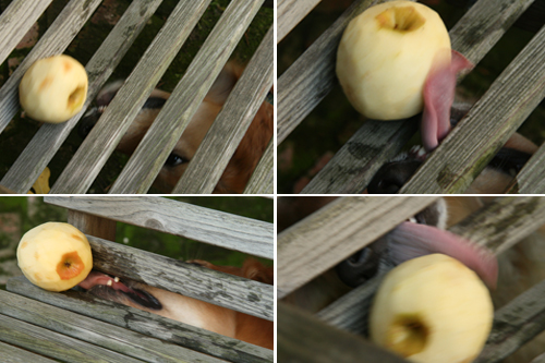 Sadie had worked her way under the bench and was trying to lick the apple through the slats.  The swinging bench would move and she would try again. Kind of like bobbing for apples upside down. To no avail she worked tirelessly to get that apple off the bench where she could eat it in its entirety.