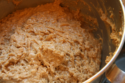 Let stand for at least two hours.  If you are making this the night before, place the dough in plastic wrap and then inside a Ziploc bag.  If the mixture is too wet to wrap adequately, you can add another 1/2 c. of flour at this time (up to one whole cup) and work it in with your HANDS until a dough forms. Note the consistency of the final dough consistency in the picture below.