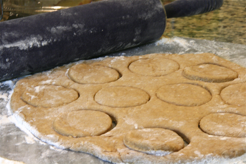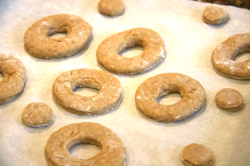 Use a round cookie cutter to cut the dough into doughnut circles.  I used a cap of my pourable 1/2 gallon of milk carton to cut out the doughnut hole.  It worked great!  Flour your cap in between each cut.  Roll out the left-overs of the first portion of dough and repeat until you have cut out the first half of the dough.