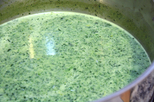 Finally, dump your processed spinach and soup into the pot, add the rest of the carton of soup, whole milk or half and half depending on how healthy you want to make this; dust in some nutmeg, white pepper and salt and let it simmer for 10 minutes or so. If you want it pureed, you can use an immersion blender or regular blender or simply eat it as is with a piece of toast.