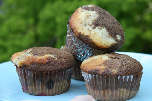 Pour half of the batter into a separate bowl. Add the cocoa powder and extra teaspoons of milk to this bowl, stirring until smooth. Dollop one large spoonful of vanilla batter and one large spoonful of the chocolate batter side by side (ish) in each paper muffin cup. Use a butter knife or skewer to make a zigzag patter through the batters to marbelize. Mine did not look marbelized at ALL before baking and then voila, they came out beautifully anyhow. Let the cupcakes cool completely before topping.