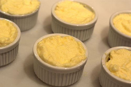 To Make the Souffles: Prepare your ramekins by smearing a little butter on the bottom and sides and then sprinkling a smattering of granulated sugar in each one. Spin the ramekin slowly over the sink so that the sugar coats the sides and the bottom of the ramekin.