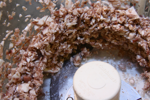 Clean and de-stem your button mushrooms. Throw 1/2 of your button mushrooms in your food processor or chop by hand. You want the mushrooms chopped into bits (see photo in post above of chopped mushrooms). Remove the chopped mushrooms from the bowl and finish off the chopping of the second half of your button mushrooms in the food processor. Go ahead and add half of the portobellos to your food processor as well. Chop together.