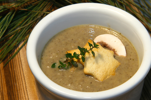 Once the soup is entirely pureed, pour the soup back into the stock pot and add the milk. Stir over a low heat. While your soup is heating back up, slice the reserved portabellos and saute with 1 tablespoon of butter in a small saute pan. Use these as garnish in each bowl of soup with a small sprig of thyme.