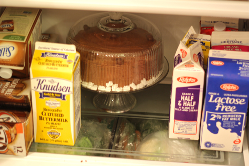 See? No vodka = cake fits in fridge. I know, you have always wished you could see the inside of my fridge just like on Cribs. Wish. Granted.