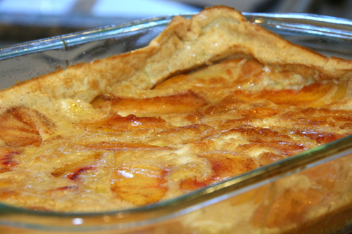 This re-post is one of my very earliest ones when S&C had virtually four followers; my niece, Lindsey, my parents and my daughter, Zoie. But since many of you have not been following since the dark ages of my blog, I thought I might share this sunny and golden “Dutch” Peach Pancake.