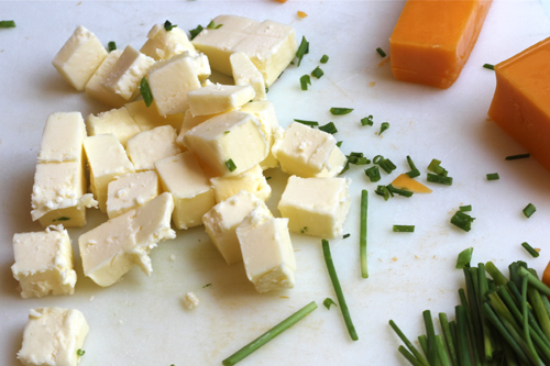 But thirdly, what are the white cubes next to the yellow cubes in the photo above. I assume the darker orange is the cheddar, is the other cubes the butter? I think I’m having a blonde moment. Which is bad for a brunette. 🙂