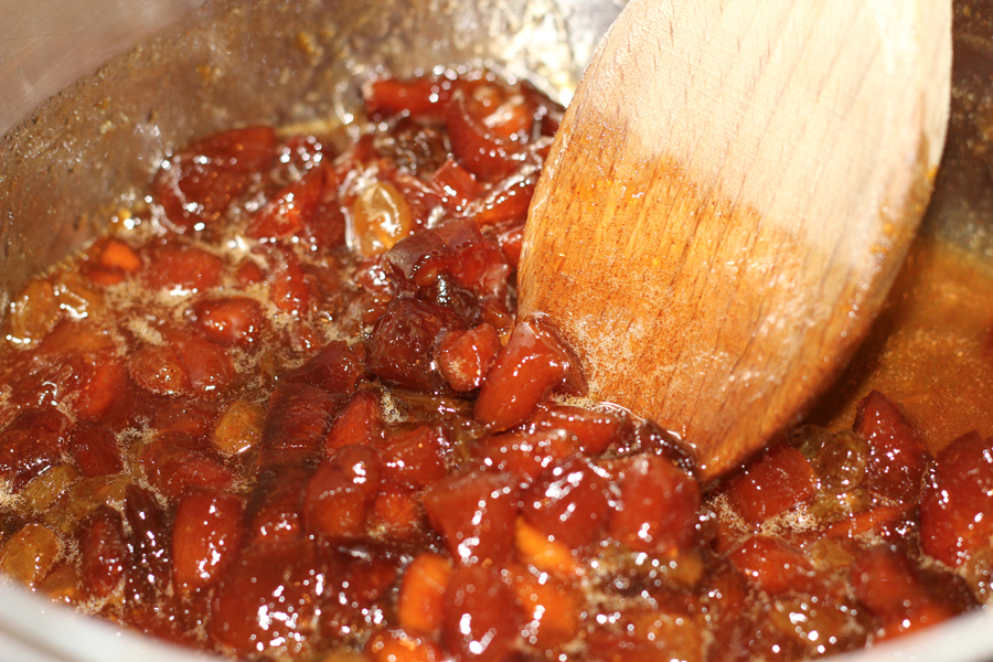While the cookie dough is refrigerating, make the filling: In a medium, heavy, nonreactive (ceramic coated works well) saucepan, stir together chopped dried apricots, raisins, honey, marmalade, cinnamon and 1/2 c. water. Bring to a simmer over medium heat.  Cook, stirring every so often, until the dried fruit is soft and the water is almost absorbed…about 10 minutes.