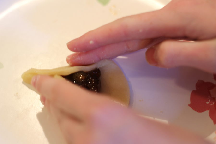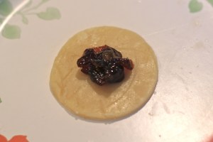 When the filling and the dough are ready, take out one layer of the dough only and peel away the wax paper. Take out the filling as well. Line tw0 cookie sheets with parchment paper and preheat your oven to 350 degrees F. Using a 2.5-3 inch round cookie cutter, cut out the round circles from the dough. Place round circle on a clean plate or floured work area and put a teaspoon of filling in the center of the circle. Imagine your circle in three equal sections.
