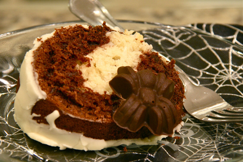 Maybe a Chocolate Macaroon Filled Bundt Cake decorated with spider web icing and chocolate tarantulas will haunt your guests appropriately…