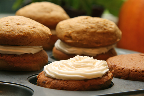 I see things like these adorable and enticing pumpkin whoopie pies and it makes me so wish I could eat pumpkin. 🙂