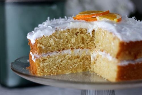 Maybe his birthday was beginning to have a positive effect on me. As the cake cooled and I shaved off a bit of a layer to “even it out” (please translate that to sneak a bite), I nibbled and nibbled and then nibbled some more. I couldn’t help myself. It was positively d-i-v-i-n-e! The tangy burst of orange was perfection. Drenching it in a little orange simple syrup, frosting it with the cream cheese icing and sprinkling it with coconut could only make it even better.