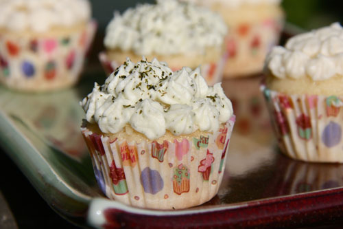 I wish I could send you one of these sweet little mini coconut, cream-filled cupcakes with Matcha frosting.  They are soft, with a tender crumb, have a mild dreamy coconut flavor, and the rich, smooth frosting is perfectly offset by earthy green tea.