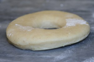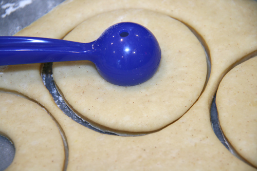 Turn dough out onto a lightly floured surface. Roll out with a lightly floured rolling pin into a 12-inch round. Cut out as many rounds as possible with 3-inch cutter, cut a hole in center of each round with 1-inch cutter (or melon ball scoop like I did!), and transfer doughnuts to a lightly floured large baking sheet or on a baking sheet lined with a Silpat mat.