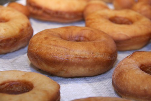 Heat 2-1/2 inches oil in a 4-quart deep heavy pot until it registers 350F on thermometer. Fry doughnuts 2 at a time, turning occasionally with a wire skimmer or a slotted spoon, until puffed and golden brown, about 2 minutes per batch. Transfer to paper towels to drain. (Return oil to 350F between batches.) Allow to cool completely before glazing.
