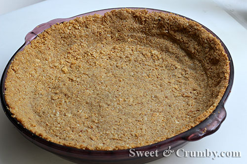 Stir together graham crumbs and nut crumbs. Melt butter in microwave (about 30 seconds or so) and add brown sugar and melted butter to the crumb mixture. Stir until the mixture comes together. Press into an ungreased pie plate, making sure to evenly press crumbs up the sides. Use wax or parchment paper to press down on the crumbs to flatten crumbs and compress mixture evenly. You can even press the back of a large measuring cup onto the wax paper to try to flatten the crust. Bake for 15 minutes in the 350 preheated oven. Let cool while making filling.