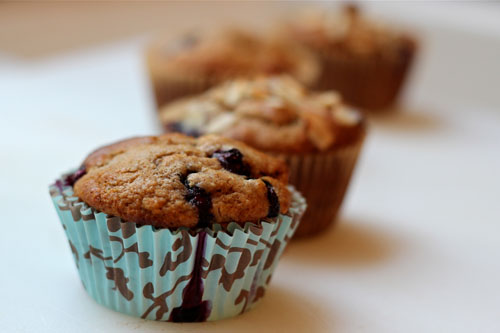 Before adding the liquid to the dry ingredients: In the bowl of the dry ingredients, stir in the blueberries and chopped apples. This will amply coat the fruit in flour and help them to stay in the middle of the muffin when baking, instead of sinking to the bottom. Now, add 1/2 of the liquid ingredients to the dry ingredients and stir gently with a rubber spatula (no whisking now my friends…batter will be tough as nails if you whisk now). Add the rest of the liquid ingredients and stir together until just combine. Scrape the bottom and the sides of the bowl to make sure no left behind flour is there.
