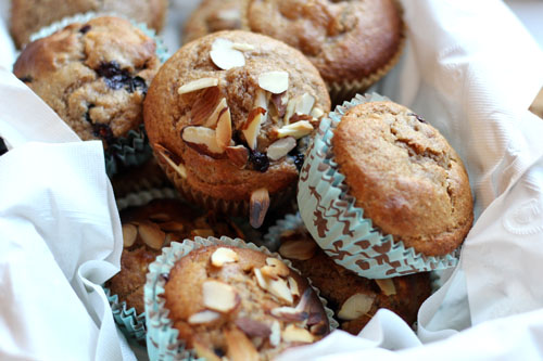 To make the muffins: Preheat your oven to 400 degrees Fahrenheit. Line your muffin pan with muffin cups. In a large mixing bowl, lightly spoon your flour into a measuring cup, don’t pack. This is probably the number one reason for dry muffins…too much flour. I usually stir up my flour before spooning to get it light and fluffy and then gently spoon it into my measuring cup,leveling it with my handy index finger (or use a knife). Whisk together flours through baking soda. Important to whisk so that it gets well mixed and fluffed up a bit.