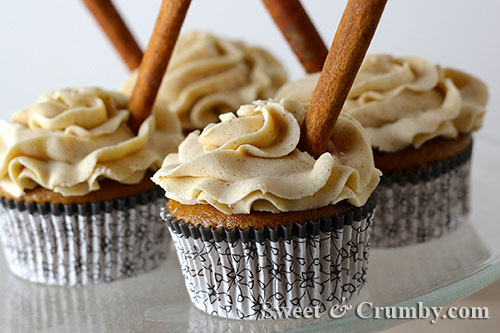 To make the frosting: Beat the butter and sugar in the bowl of a stand mixer fitted with a paddle attachment. Start on slow speed and then work up to a high speed. Add the milk, vanilla and ground cinnamon and beat on high for 1-2 minutes or until creamy and smooth. Pipe or spread onto cupcakes.